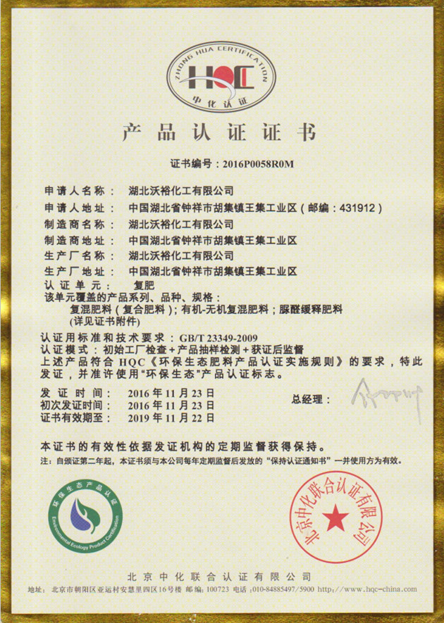 ??? 湖北沃?;び邢薰境晒Λ@得環(huán)保生態(tài)肥料產(chǎn)品認證。湖北沃裕一直以來就非常重視肥料產(chǎn)品的質(zhì)量和安全環(huán)保性能,堅守“四個確?!保?/p>