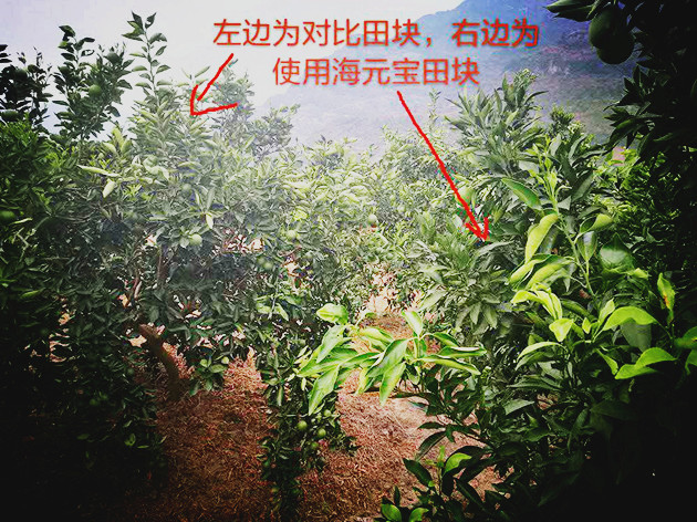 ? ? 但是當我們走到韓慶祥地里,完全是另外一種景象:他家的柑橘樹一片濃綠,只有少數(shù)嫩梢出現(xiàn)缺水現(xiàn)象。周邊柑橘田塊都不同程度的受到旱災,有幾個農(nóng)戶正在用車拉水在抗旱。示范園柑橘遠處望去就像沙漠里的一片綠洲!有幾個干活的農(nóng)戶也停下了手里的活過來交流,他們開始都以為示范田這塊地是專門抗旱了的。韓慶祥說:“我沒時間抗旱,現(xiàn)在也沒水源,我這塊田是用了‘海元寶’復合肥的功勞。