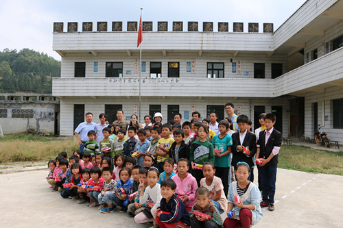 盡管一路上泥濘的山路崎嶇不平,剛啟程不久一輛車就因?yàn)槁窙r提前“罷工”,深圳中農(nóng)的愛心團(tuán)隊(duì)在嚴(yán)重超載的車上擠得像面團(tuán)一樣,10多里的山路,花了2個(gè)半小時(shí),但當(dāng)載滿禮物的小車蹣跚著終于到達(dá)馬路河希望小學(xué)時(shí),早已等待多時(shí)的全體師生及其家屬們的歡呼聲,讓深圳中農(nóng)的愛心團(tuán)隊(duì)覺得一切都是值得的。